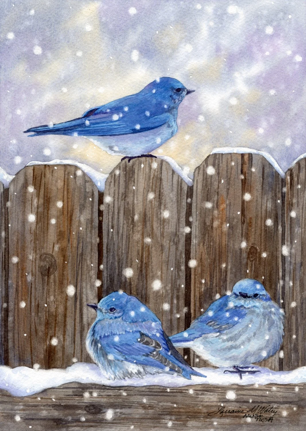 Story Behind This Painting: These bright blue Mountain Blue Birds came into our yard one winter. They landed due to the snowstorm and spent a day waiting to continue their migration. Their blue feathers stood out against the neutral fence posts and the gray day.